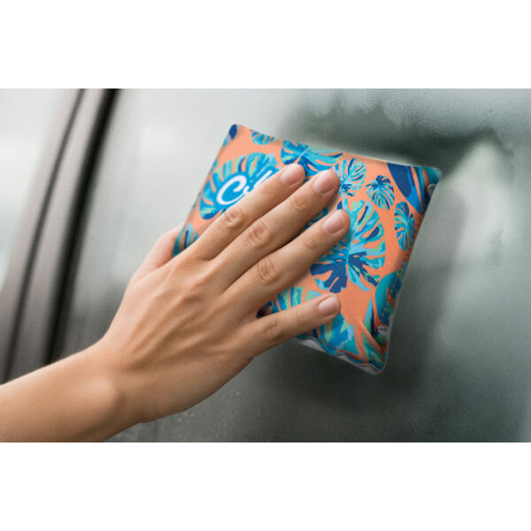 Custom made auto voorruit anti-mist spons bedekt met RPET microvezel en absorberend synthetisch leer. Met sublimatie bedrukking aan de voorzijde. MOQ: 50 stuks.
