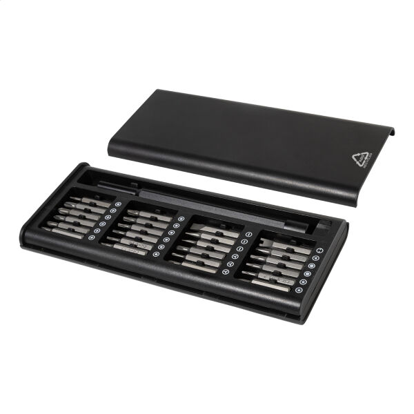 Precisie schroevendraaier set met 24 bits in gerecycled ABS geval. De schroevendraaierhandgreep is voorzien van een magnetische bitbevestiging voor snelle en veilige bitveranderingen.Manybit - RABS schroevendraaier set
